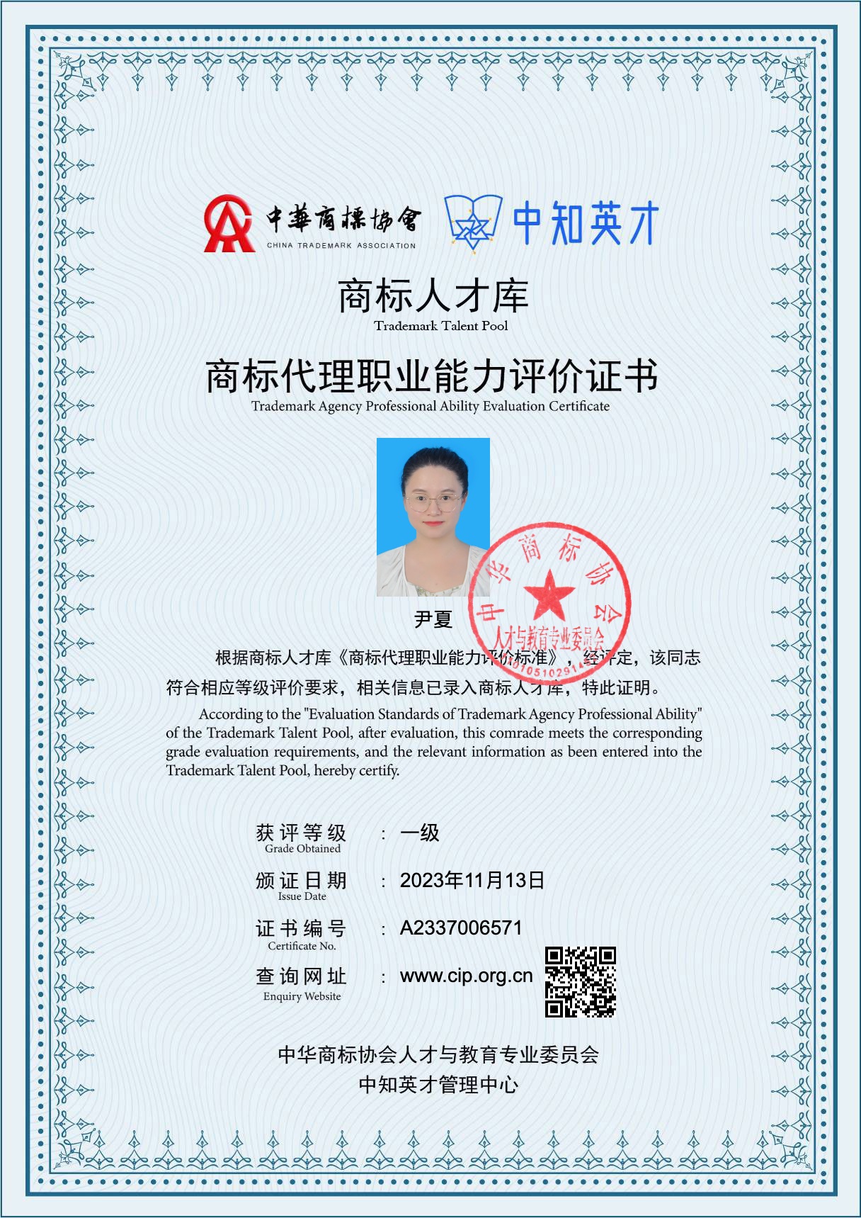 我司合伙人尹夏入選中華商標(biāo)協(xié)會商標(biāo)人才庫(一級)